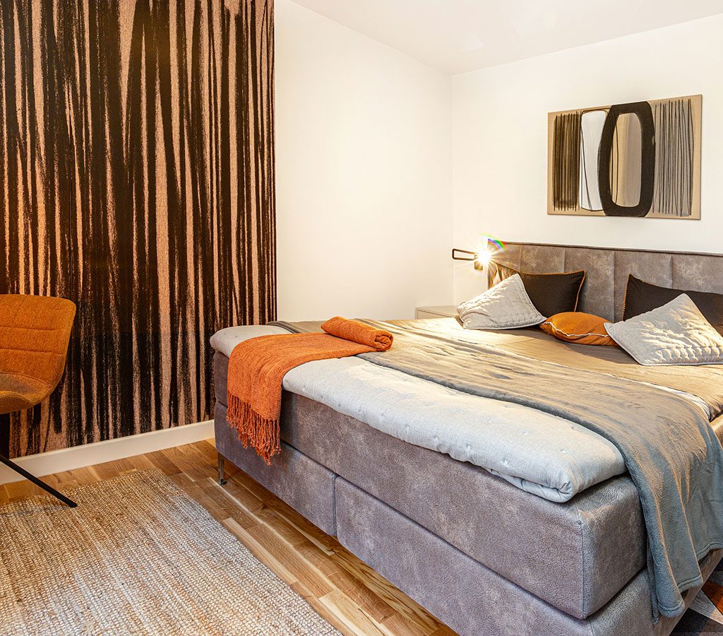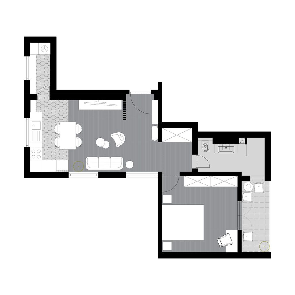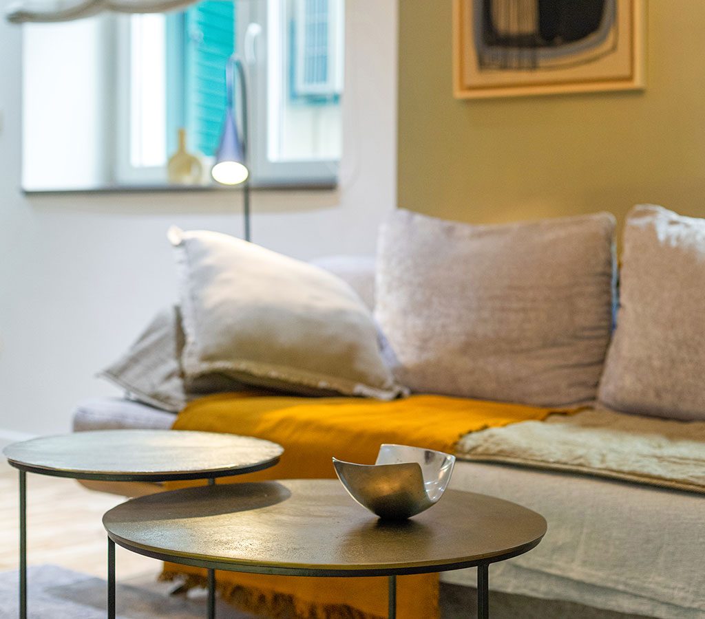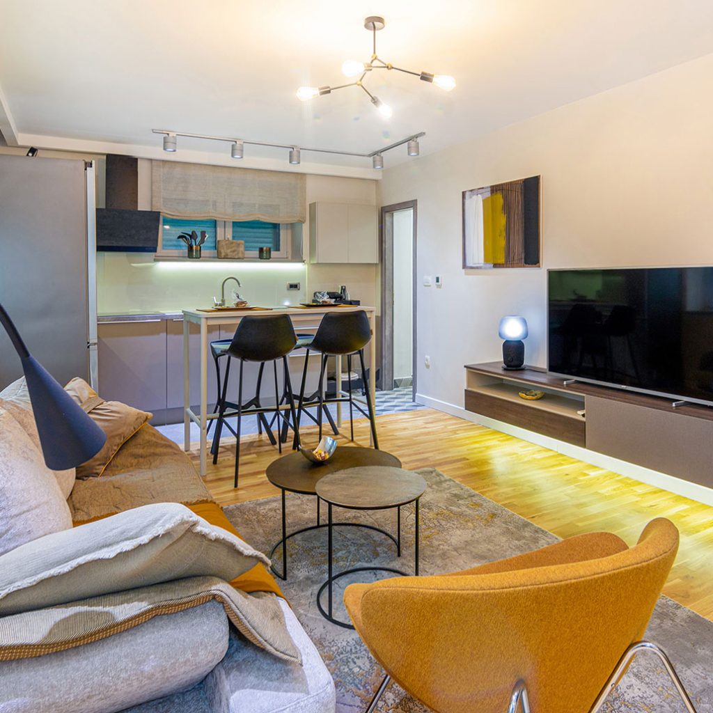 The investors wanted to perform a complete renovation to create a functional apartment with an open-space living area and modern furnishings for 4-star tourist rental. By demolishing the entrance partition wall and fully renovating the floors and installations, they achieved a space where only the highest quality materials were used, along with custom-made furniture and selected designer pieces.